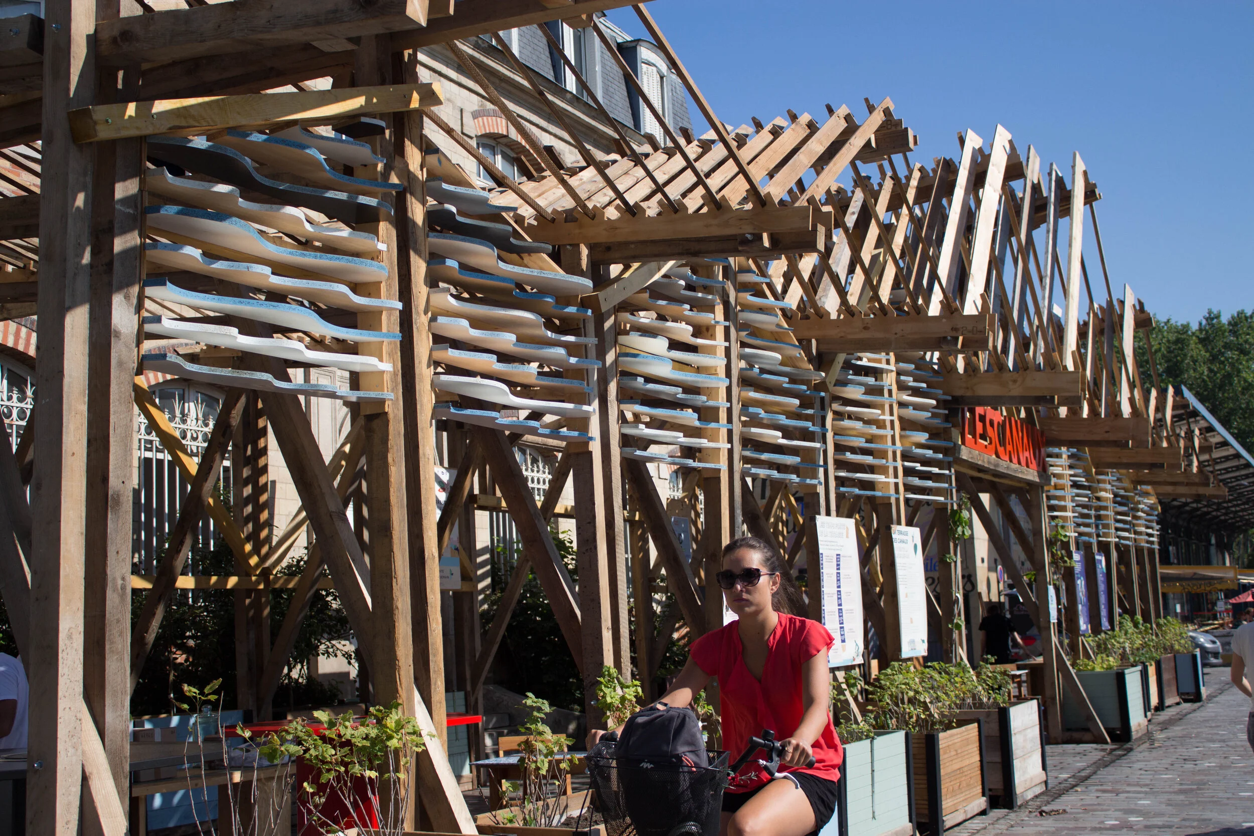 1er projet commun du collectif Re-store : l'Ombrière estivale pour La Maison des Canaux, entièrement en réemploi !