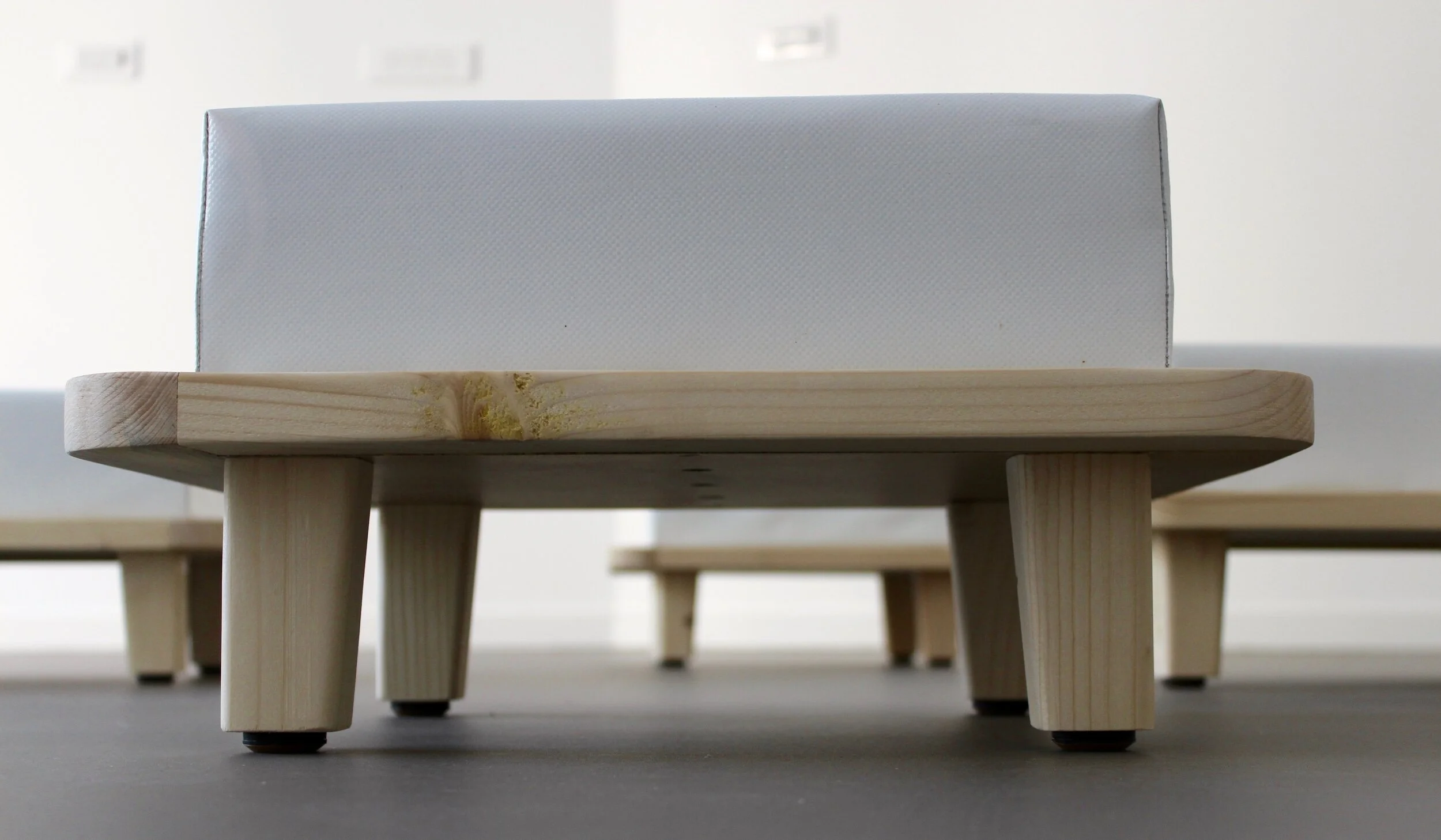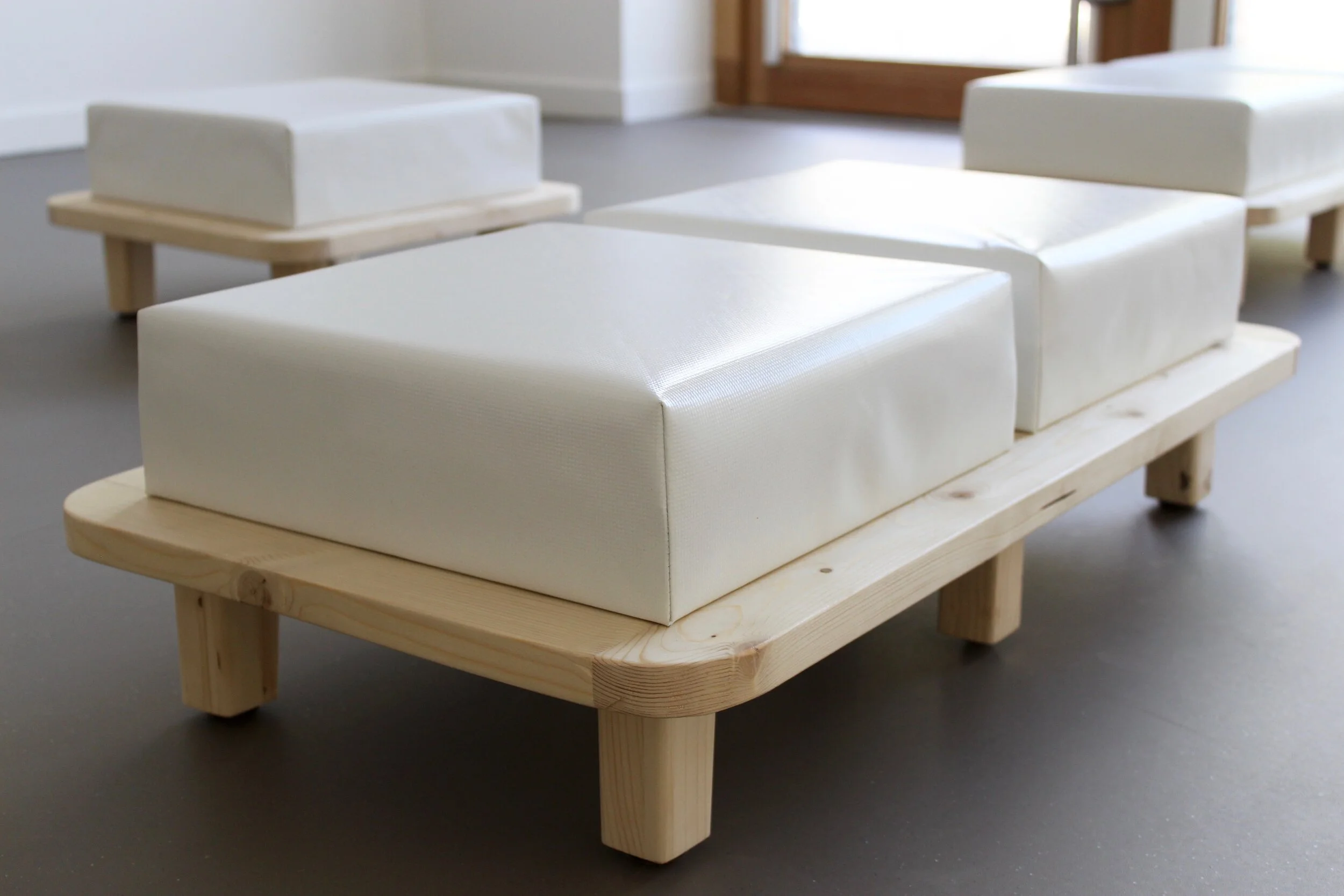 Matière de l’assise : structure bois de chutes, mousse issue de l’événementiel et bâches publicitaires retournées de notre partenaire BILUM