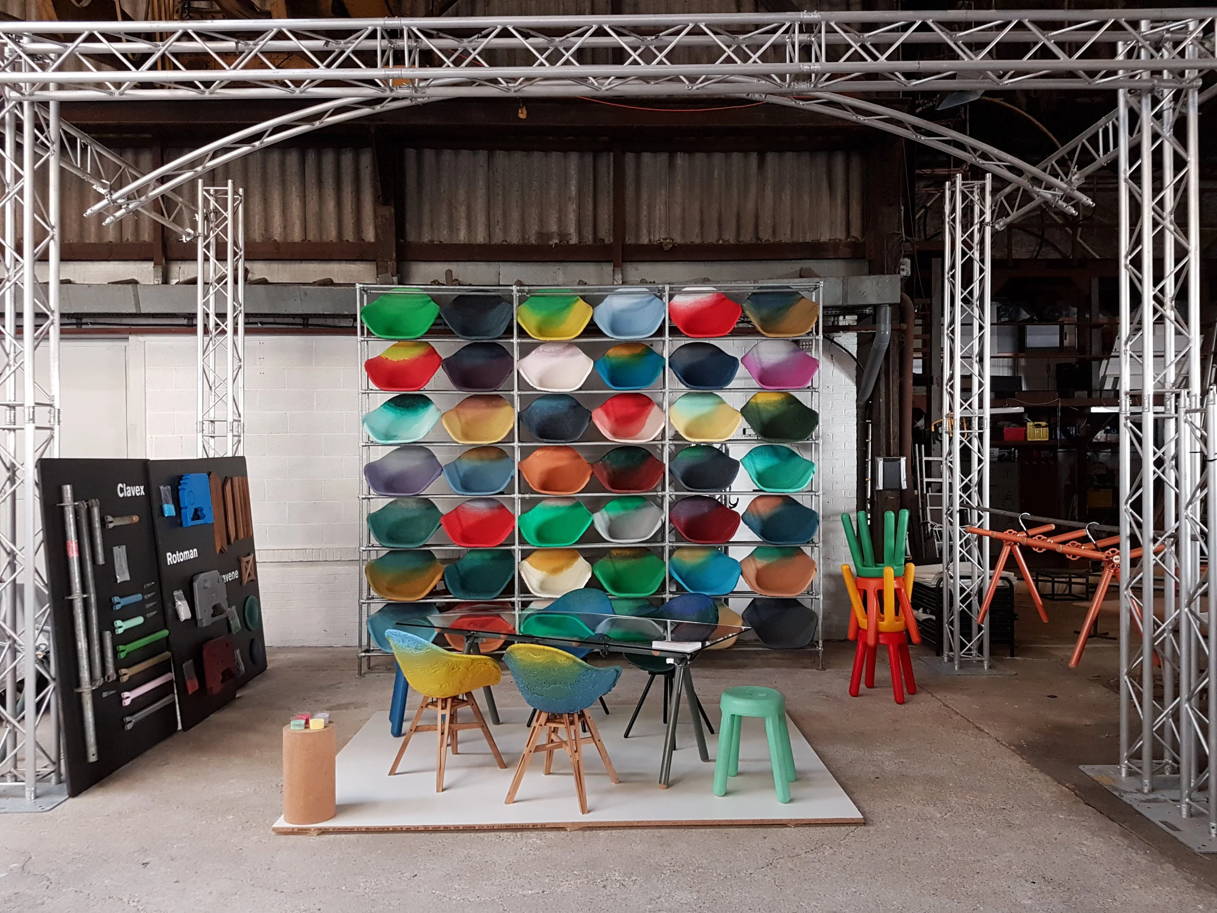 Chez le même fabricant de plastique qui leur fournit le polypropylène de Gravêne, ils se sont rendu compte que celui-ci fabriquait tous les jours des pièces de test pour valider les caractéristiques mécaniques de ses plastiques. Alors autant donner à ces pièces tests une forme de tabouret et en faire des objets de design !!